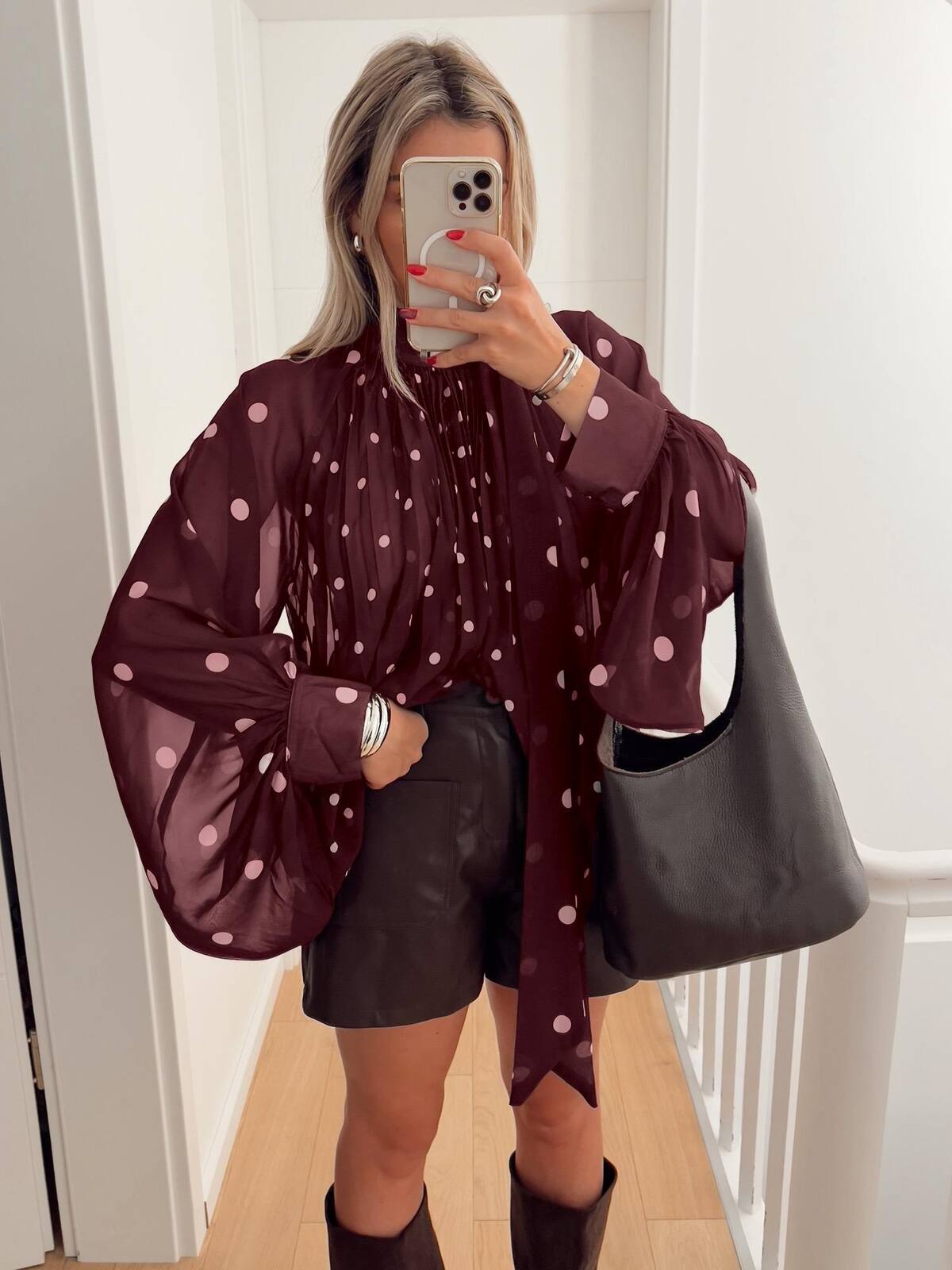 Blouse plissée à pois et col montant avec noeud sur le côté.